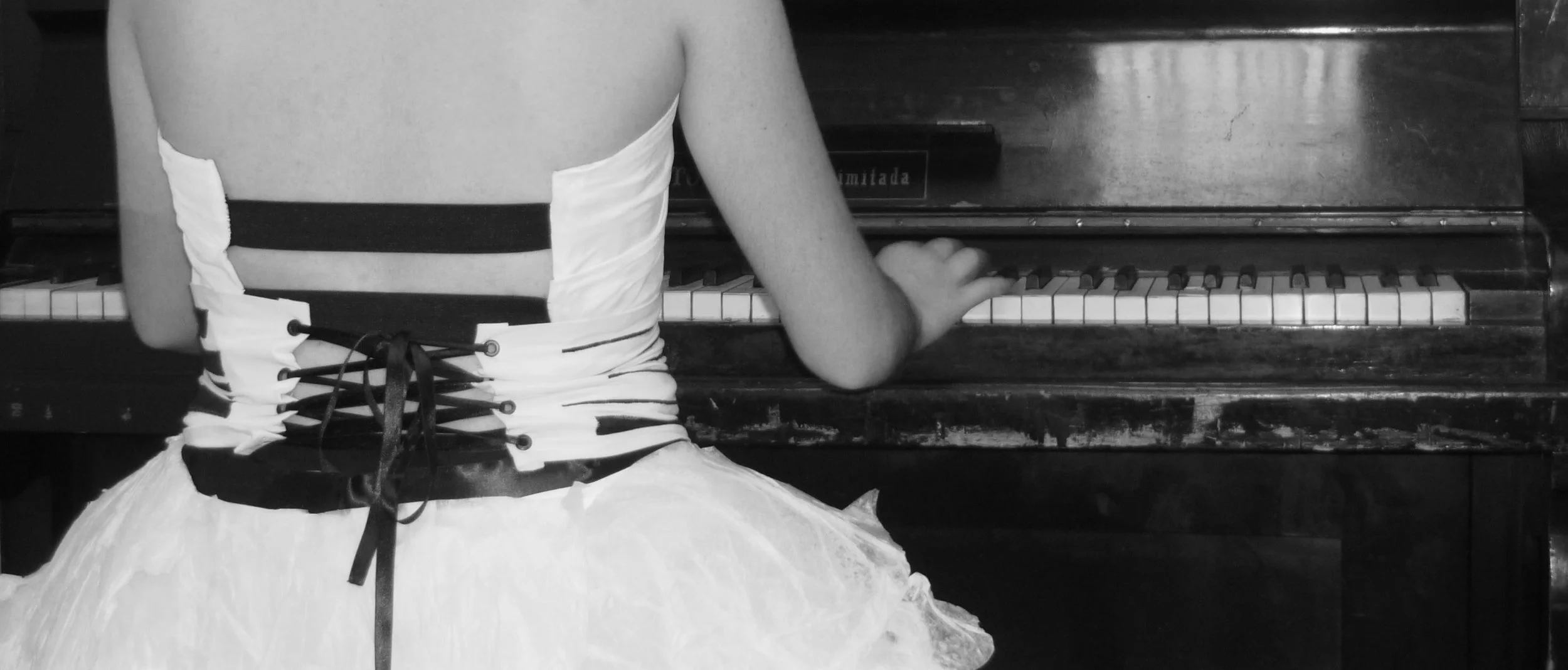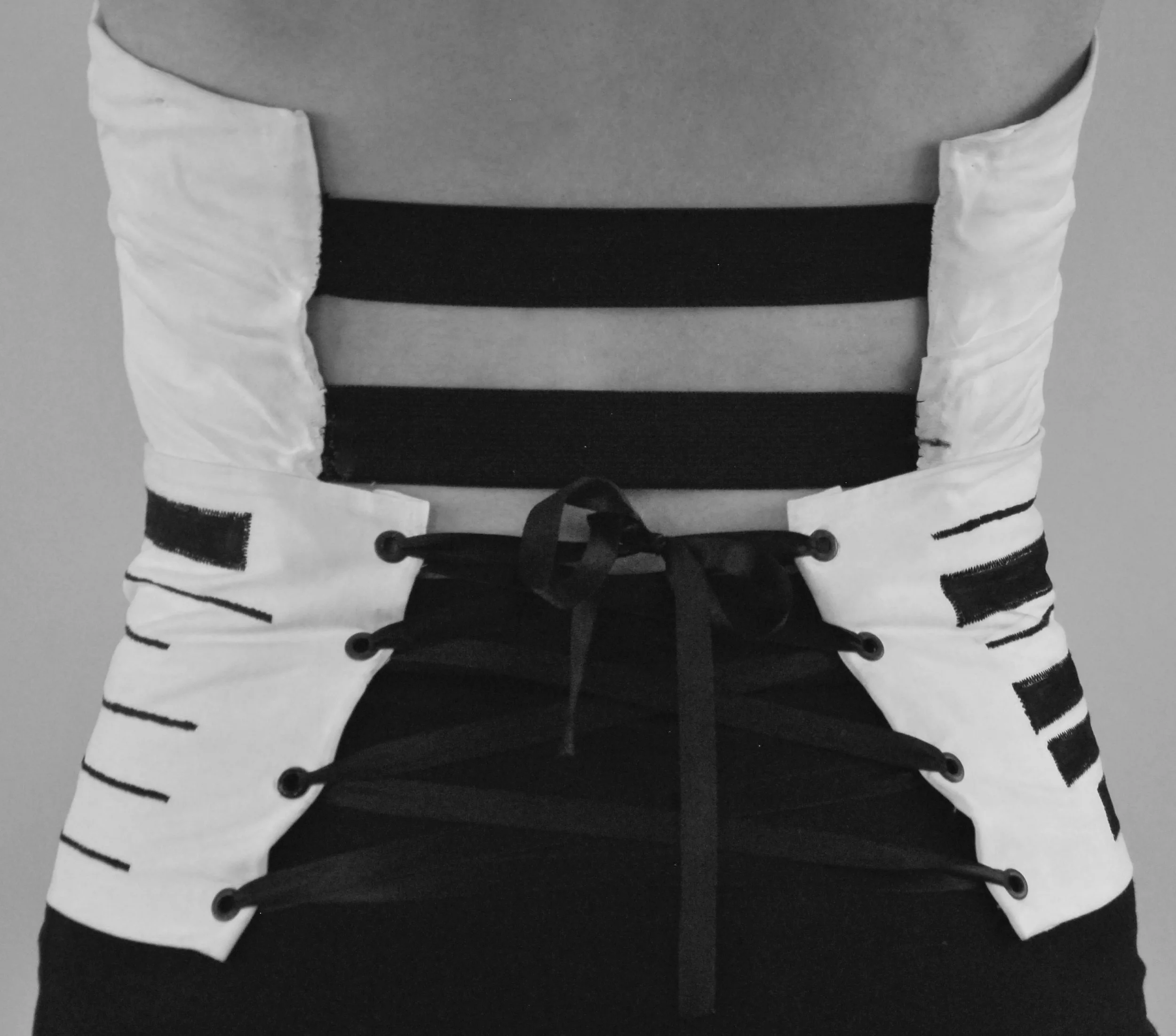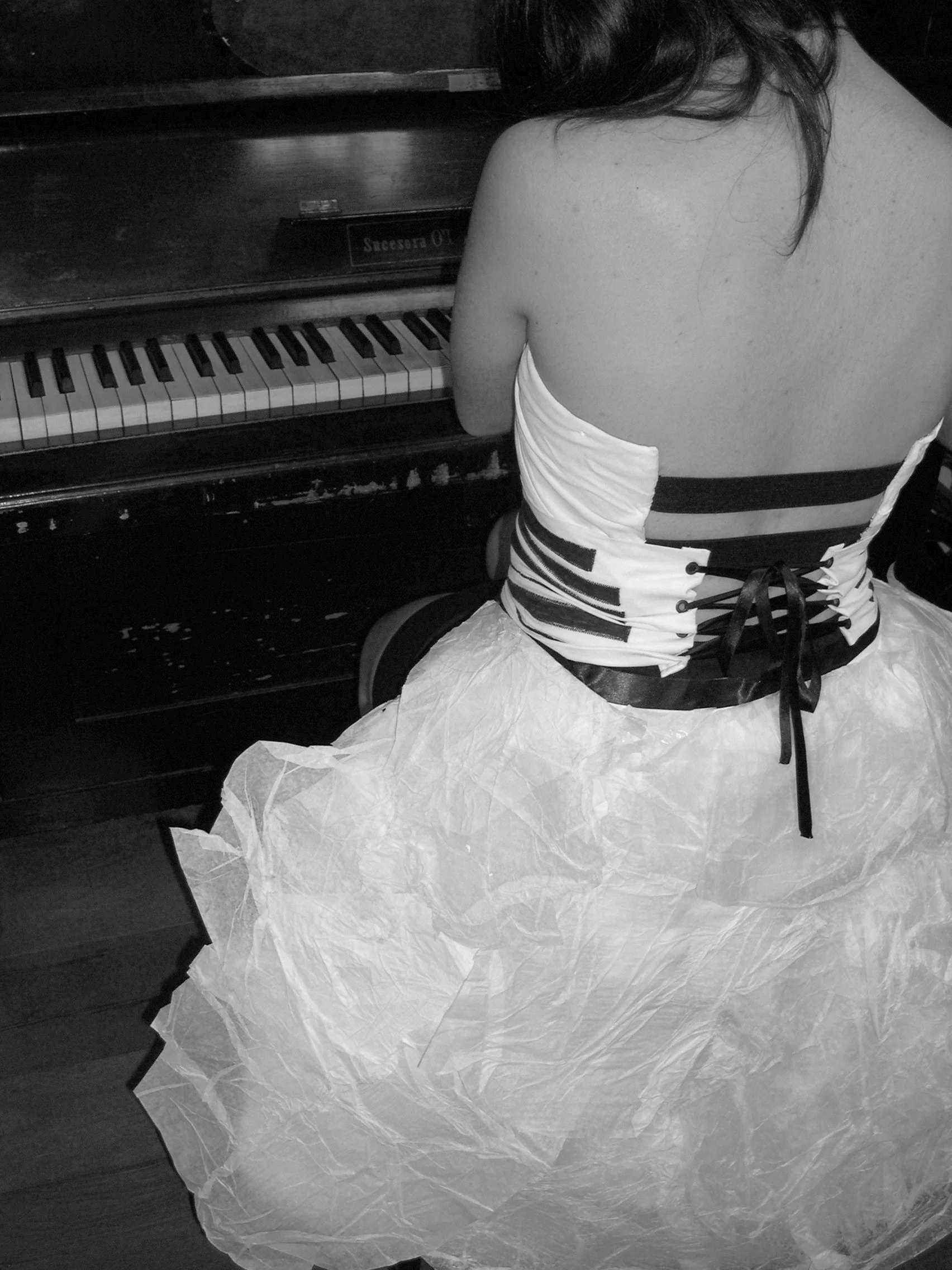 Mi primer vestido, diseñado y fabricado en 2008, me inspiré en el piano y utilicé materiales no convencionales como yeso y papel. Esta pieza refleja mi interés por experimentar con texturas y formas, fusionando la música y la moda en un diseño único.